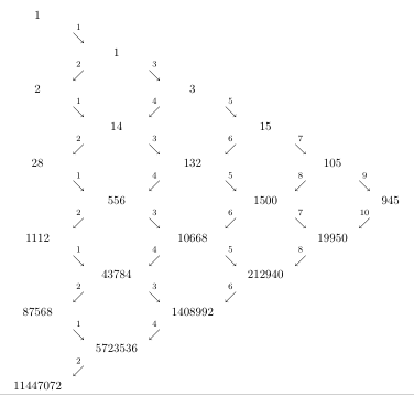 | Recursive triangle for calculating the number of alternating transpositions. |
