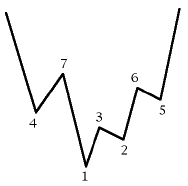 and dealing with the end points as in the illustrated example. Since 1 is always a low point in this classification, in any permutation, its R' is omitted as redundant. Thus the alternating permutation 4713265 is of type R'L'R'R'L'L' (as 2, 4, and 5 are low points; 3, 6, and 7 are high points).